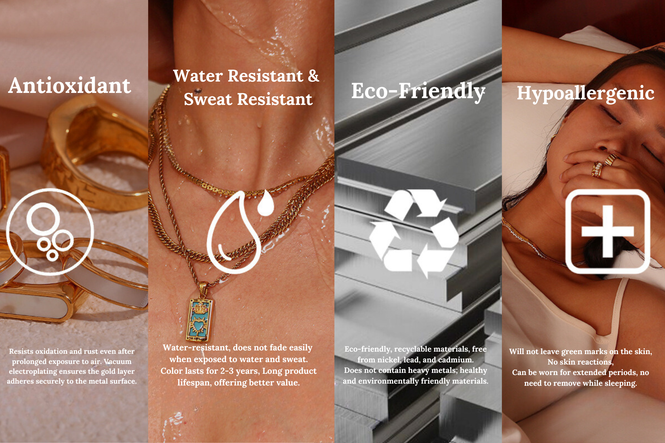 Our pieces are made with high-quality 18K gold plating over stainless steel for a long-lasting, affordable alternative to solid gold.