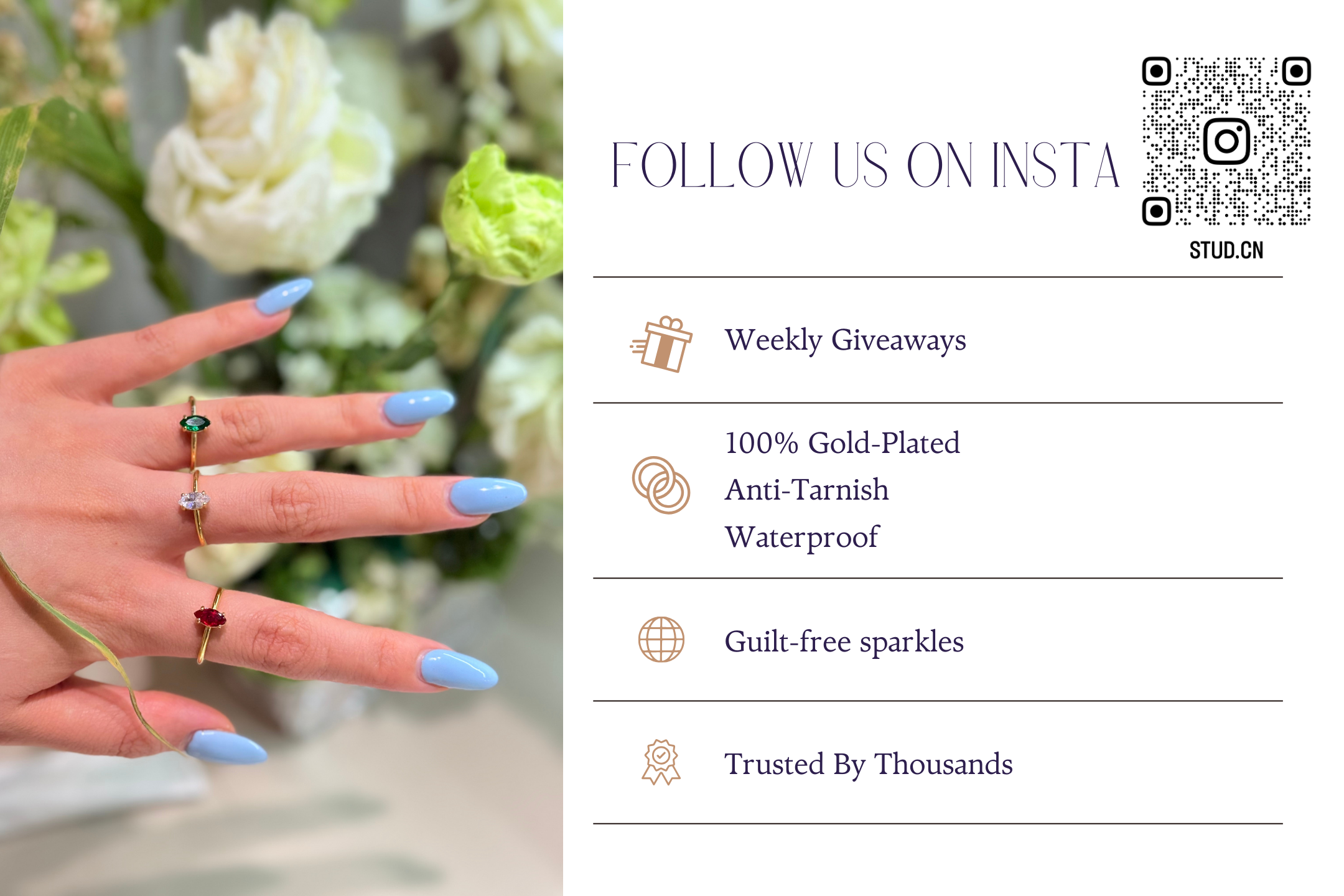 Our pieces are made with high-quality 18K gold plating over stainless steel for a long-lasting, affordable alternative to solid gold.