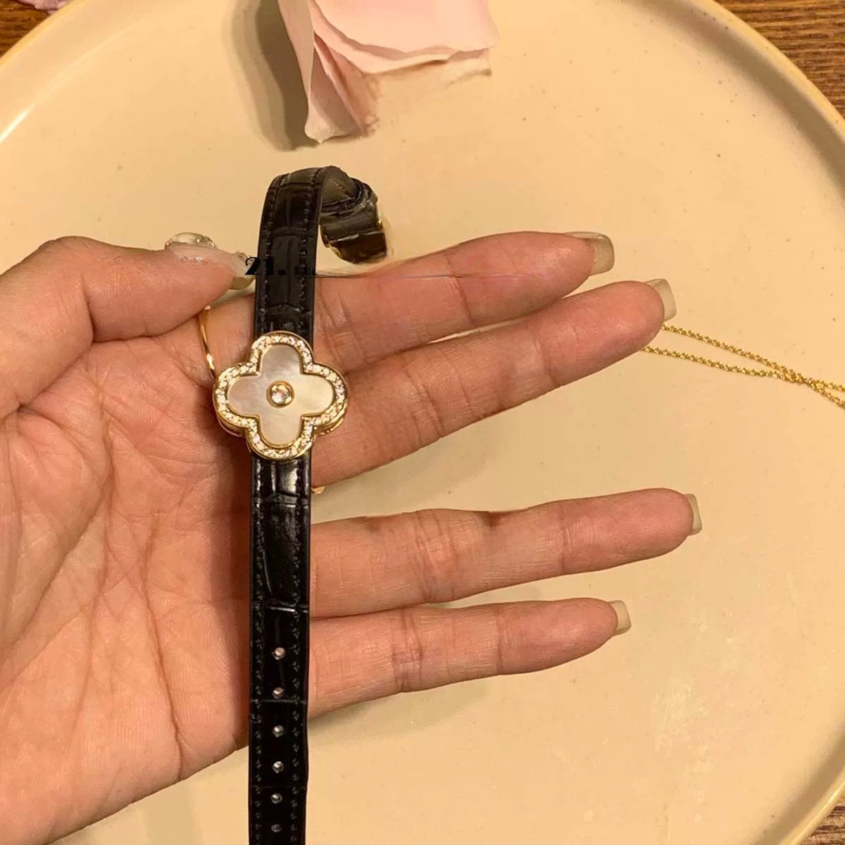 Elevate your wrist game with this luxurious clover charm bracelet, featuring a radiant mother of pearl inlay framed by shimmering crystals. The classic black leather strap adds a chic contrast to the 18K gold-plated floral charm, making this piece both timeless and modern.