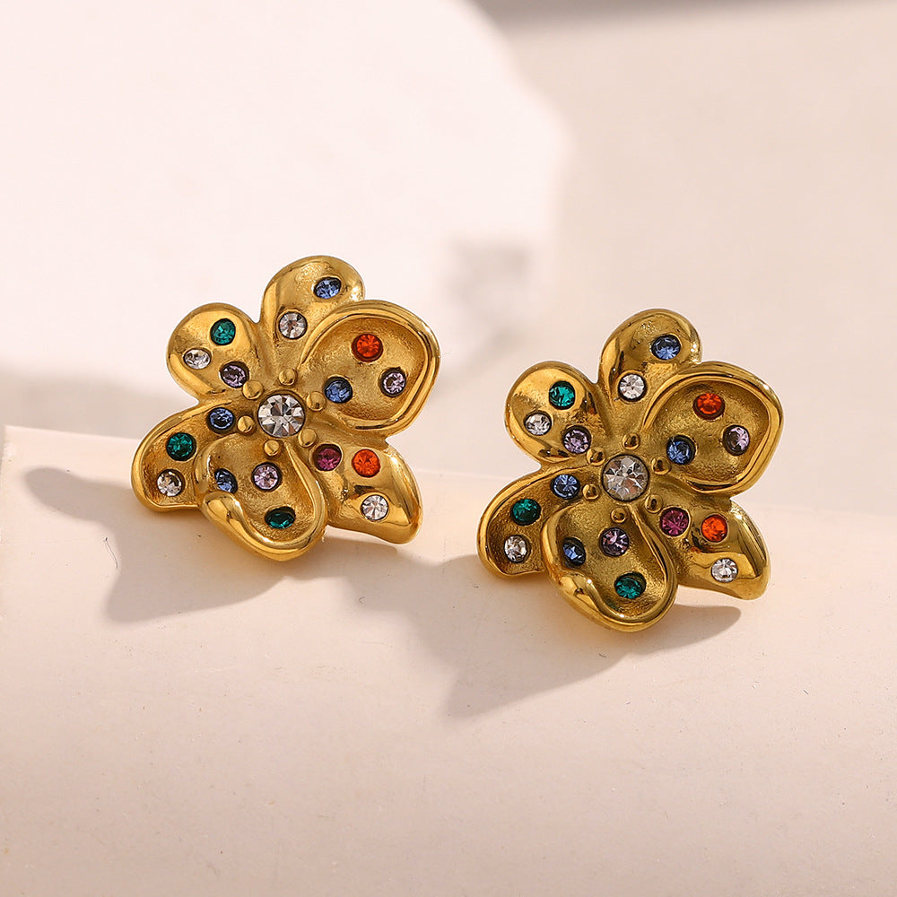 18K gold-plated stainless steel flower stud earrings featuring multicolor zircon stones. Waterproof, hypoallergenic, anti-tarnish statement earrings with vintage charm.